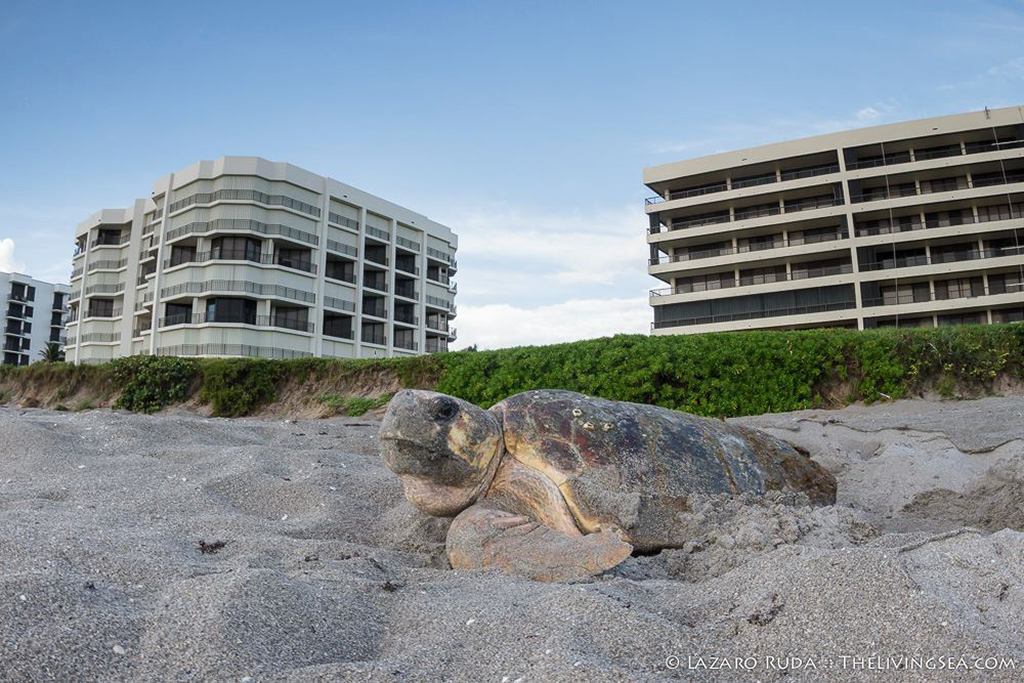 During the height of loggerhead nesting season (June/July) resident turtles are joined by transient individuals, causing the population to more than triple in number. Off shore on the reef tracks in the 60-foot range between Jupiter and Boynton Beach, divers have describe themselves as being out numbered by turtles, running across as many as 15 to 30 plus large turtles bedded down for a nap on the reef during the course of single drift dive.