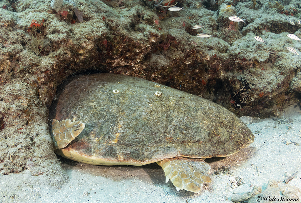 An interesting factoid about hawkbills is that they do not nest on beaches along Florida Southeast coast. Instead, their primary nesting grounds take place in the Caribbean, plus nesting is not seasonal, but instead takes place year round. Most of the Hawksbill turtles we see are juveniles that are two to three feet in length, and not yet sexually mature. A fully mature adult will measure 45 inches / 1.1 meters in length, weighing around 190 pounds / 86 kgs. If you run into a larger Hawksbill, it’s likely a transient that’s just passing through.