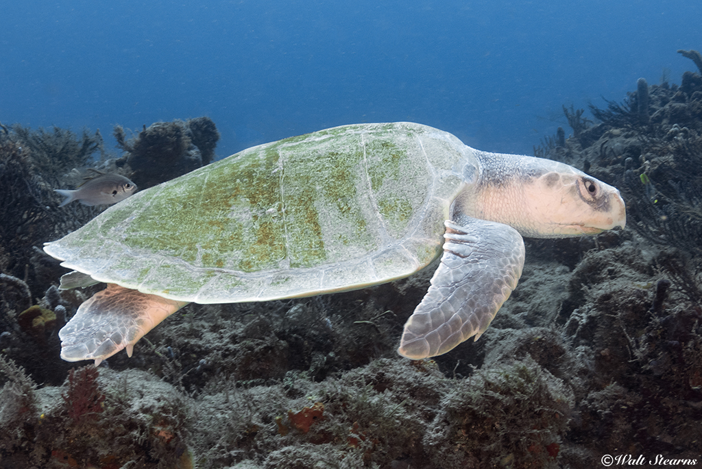 Easily recognizable by its thick rough textured shell and large blunt, almost boxy shaped head – which looks like the end of a log, hence the name, Loggerheads (Caretta caretta) are wide spread species found in both the Atlantic and Pacific Oceans. While most fully mature turtles average around 4 feet / 1.2 meters in length, it’s not unusual to come across adult females measuring 5 feet / 1.5 meters in length, weighing in at close to 500 lbs. / 226 kgs. In addition to being the third largest (in terms of weight) among marine turtles, they are also omnivorous, dining on just about anything they can get – jellyfish, crustaceans, even dead fish when they find it. This one dietary habit has made them highly susceptible to long lines set by commercial fishermen.