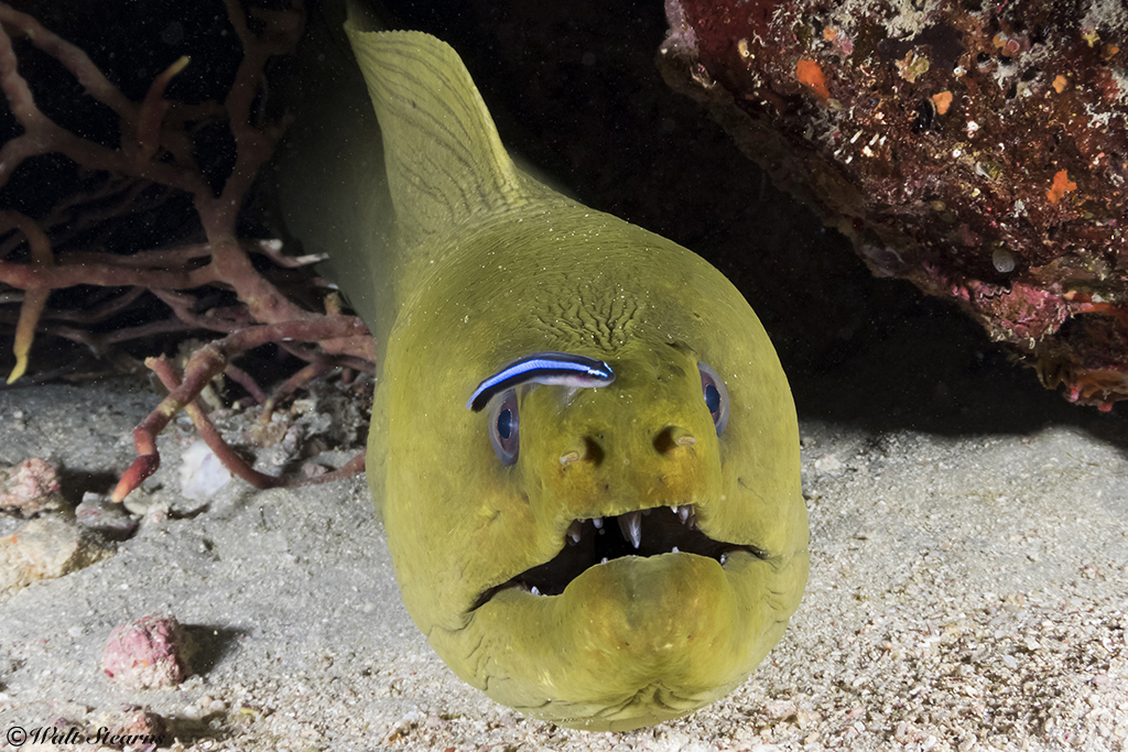 A Neon Goby (Elacatinus oceanops) purched atop the nose of a green moray eel that it has been cleaning of bothersome parasites.