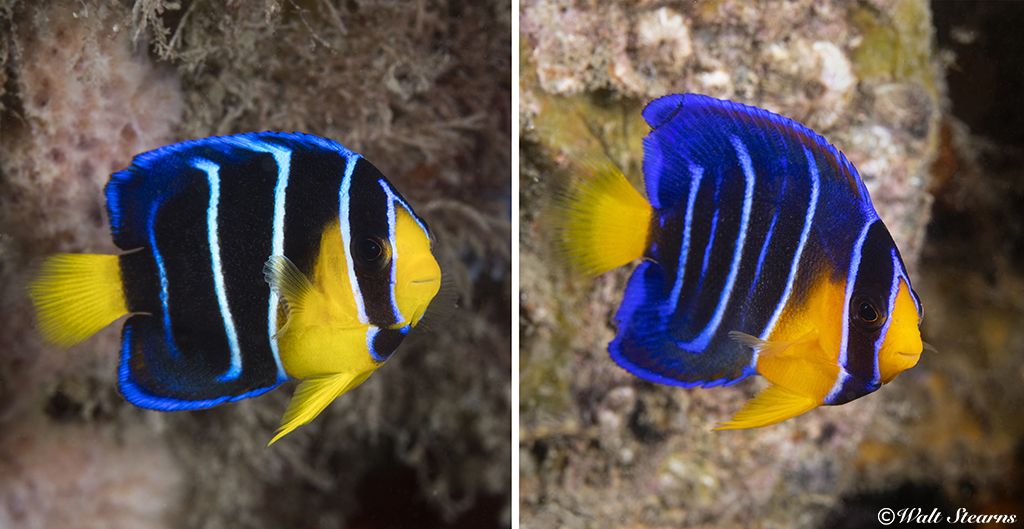 Juvenile Blue angelfish (Holacanthus bermudensis) pictured left with a juvenile Queen Angelfish (Holacanthus ciliaris) to its right.