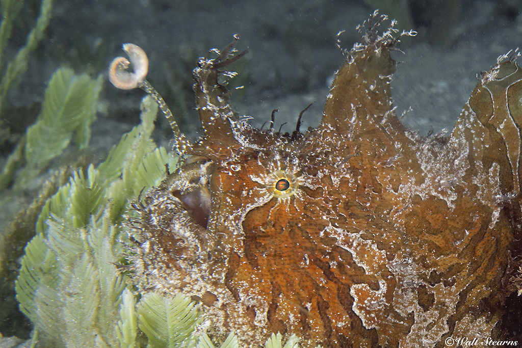 This term describes the Striated Frogfish (Antennarius striatus), a member of the anglerfish that are masters of camouflage, and homely to the point of being downright cute, they are. It wasn’t until 2008/2009 that divers even knew they existed in Palm Beach. At that time, a few underwater photographers began seeing them around the Blue Heron Bridge.