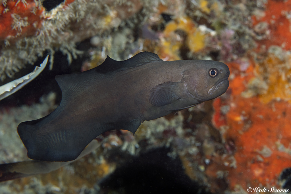 When you see a Black Brotula, there is no mistaking it for anything else yon the reef. Recorded to reach a maximum length 3 inches, the body is distinctly compressed, tapering to rear with the dorsal fin array (starting from just behind the head) and continuing unbroken all the way to the tip of the tail and on around to the belly. Sometimes found in pairs, the deep dusky brown and black coloration along the entire length of body can make black widows rather tough to find amongst shadowy confines of the reef. Between a face looking a little like Mr. Potato Head and a less than lively coloration, this fish may not win a beauty contest, but consider the adage “beauty is in the eye of the beholder.”