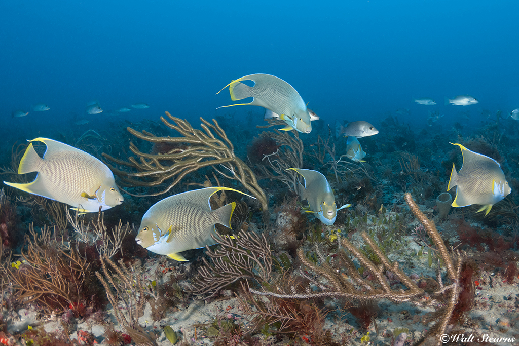 It’s not unusual to come across groups of 4 to 7 blue angels collectively feeding among the corals. The most explainable answer to why these fish is more prevalent along Florida’s east coast (particularly north of Miami) is their physical ability in handle cooler temperature ranges than other angelfish species found in the Tropical Atlantic. In fact, they may be found as far north as North Carolina, and as far away as the island of Bermuda.