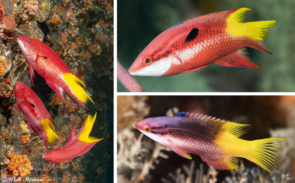 In addition to the Cherubfish, deeper reefs in the 70 to 100 plus-foot range are home to several more dazzling reef beauties. Topping the list is the Spotfin Hogfish (Bodianus pulchellus) recognizable for the flamboyant red coloration that runs across the bulk of its body, ending in bright yellow over much of its tail.