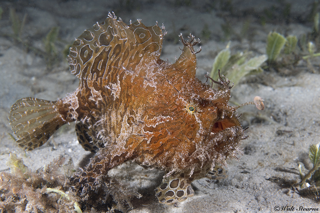Striateds run a variable range of colors from greenish gray, tan, brown and black, to even a few different shades of yellow and orange. In addition to elongated blotches and stripes running across its body, these fish are generally covered with numerous hair-like filaments and tabs across the head body and fins. This is the origin for their nickname, the hairy frogfish. Calling something that looks like it is dressed up in a ghillie suit beautiful or even handsome might be a bit of a stretch. But one thing is certain, hairy frogfish do have a rather powerful cute factor.