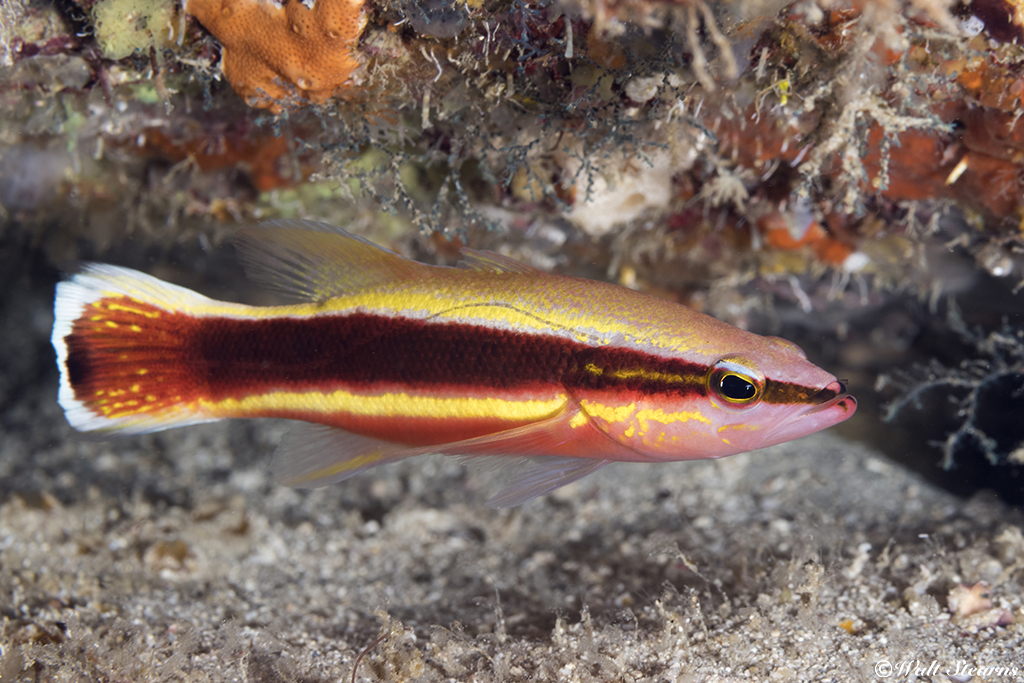 This is the Wrasse Basslet (Liopropoma eukrines). Measuring 1 to 4 inches in length, this highly colorful little dandy is identifiable by the presence of a wide, deep reddish-brown mid-body stripe that is fringed by gold-colored piping top and bottom, running from the tip of the snout to very edge of its tail. The rest of the fish’s body is generally augmented by a mix of pinkish/purple and white, creating one the most striking color patterns of any reef found here.