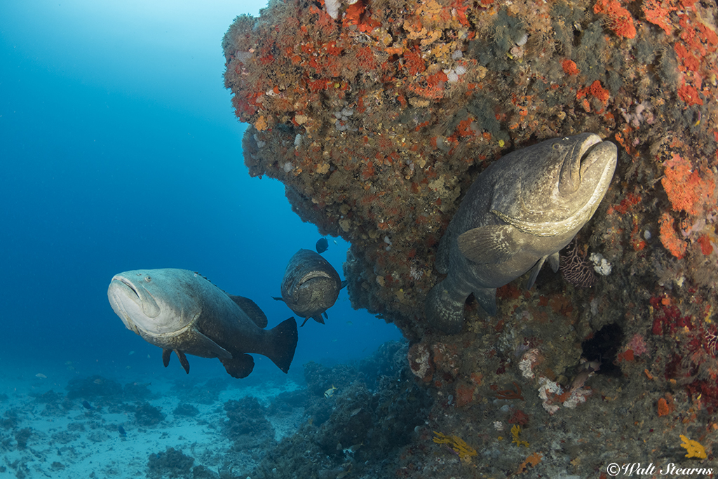 A trio of large 350 to 400 lb. goliath grouper milling in the shadow of the Juno Bar ledge provide scale to the height of the reef’s west facing ledge.