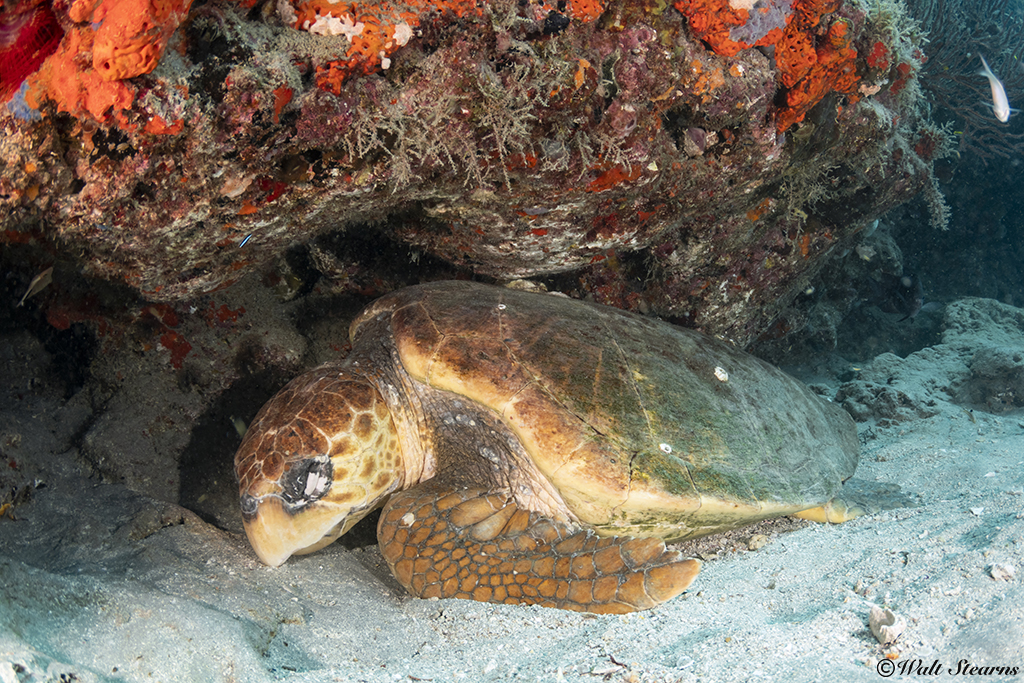 Large loggerhead sea turtle catching daytime nap beneath ledge.