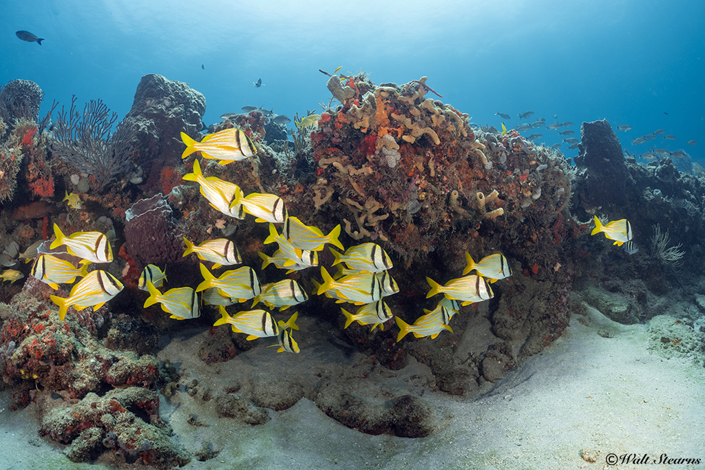 As beautiful and dramatic as the shelf can be, the greater appeal is the abundance of marine life, which aggregates along the structures and finds shelter in the numerous crevices and undercuts. Often times large schools of grunts, porkfish and snappers can be seen either milling out front or sitting beneath the reef’s protective overhangs. Overhead, divers will frequently encounter large progressions of spadefish and jack crevalle. Sometimes larger varieties like amberjacks, eagle rays or reef sharks will make their appearance, either following the fish schools or looking as if they are escorting them.